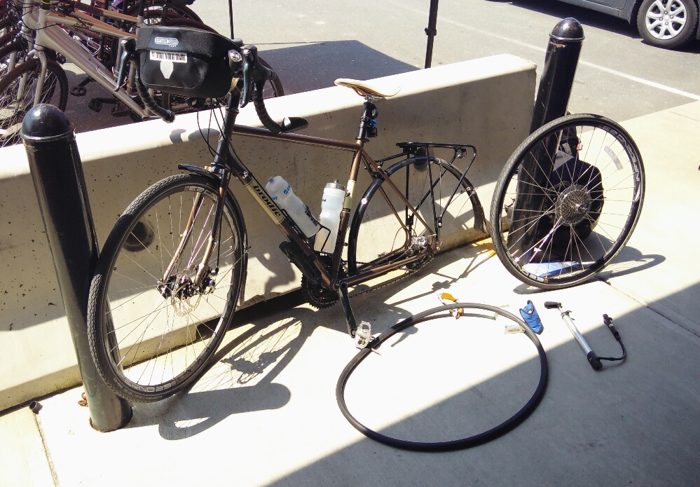 An dieser Stelle habe ich mein Hinterrad schon zum zweiten oder dritten Mal aufgepumpt, es hält die Luft nur noch für wenige Minuten, maximal 5-6km. Flickzeug und Ersatzschlauch habe ich zwar dabei, aber solange ich mit diesen kleinen Aufpump-Pausen zurecht komme, werde ich meinen Zwangsstop an den nächsten Fahrrad-Laden verlegen. Und Voilá – schon in der nächsten Menschen-Ansammlung, die man als „Ortschaft“ oder gar „Stadt“ bezeichnen kann, gibt es ein solches Geschäft. Also kaufe ich einen neuen Schlauch und sehe im Hinterrad-Mantel tatsächlich ein ca. 1cm langes Metallstück stecken. Das alles erinnert mich sehr an den ersten (und einzigen – toitoitoi) Plattfuss damals in Australien.